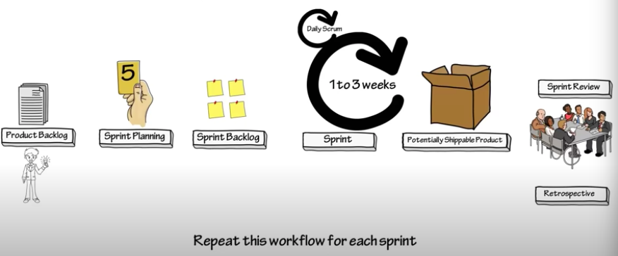 Product Backlog -> Sprint Planning -> Sprint Backlog -> Sprint -> Potential Shippable Product -> Sprint Review