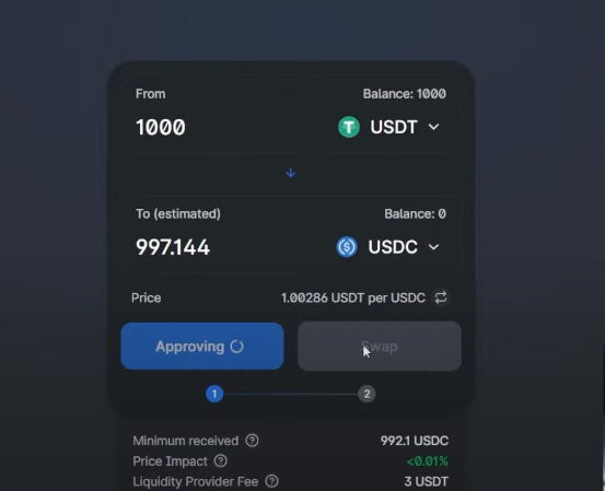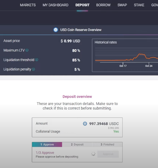 因为AAVE市场上USDT无法作为可以抵押的资产,所以需要换成USDC(另外一种稳定币)。